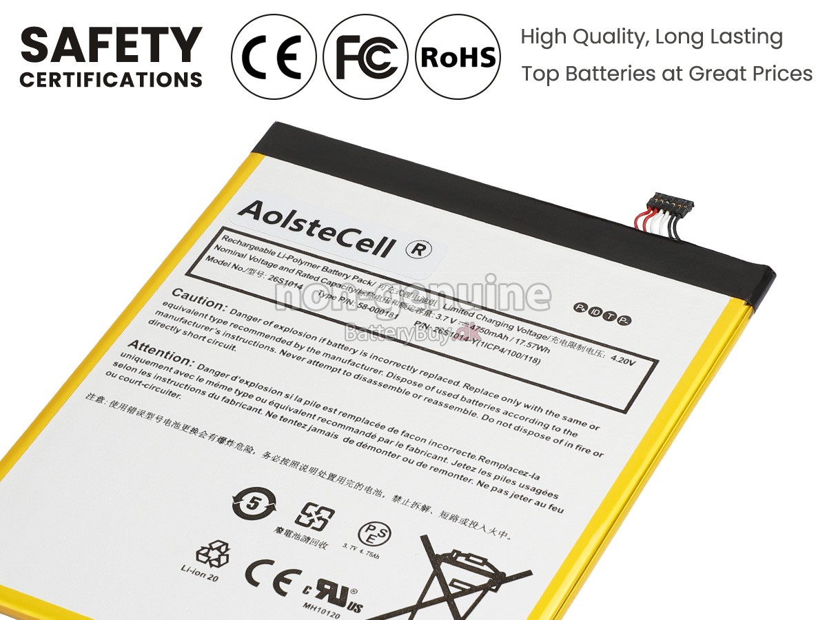 Nogle laptop batteriproducenter bruger ringere komponenter for at kunne tiltrække kunder til en lavere pris. At købe disse ringere batterier kan forårsage en række problemer som kort batterilevetid, vanskelig vedligeholdelse og endda skade på din yndlingscomputer. Men du behøver ikke bekymre dig, vi har testet Amazon 58-000219 laptop/Bærbar batteri fra mange forskellige producenter og er altid forpligtet til at give kunderne den højeste kvalitet bærbar computer batteri til Amazon 58-000219 . Vores Amazon 58-000219 batteri , der ses på BatteryBuy.dk-webstedet, skal testes med tre standardkvalitetskontroller. Vi tilbyder Amazon 58-000219 batteri , der opfylder eller overstiger OEM-specifikationer.