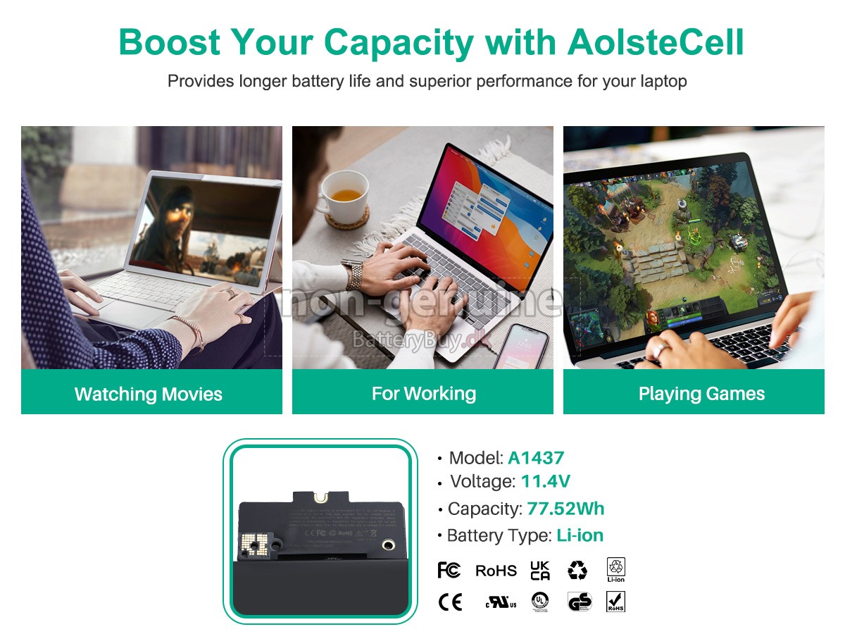 Nogle laptop batteriproducenter bruger ringere komponenter for at kunne tiltrække kunder til en lavere pris. At købe disse ringere batterier kan forårsage en række problemer som kort batterilevetid, vanskelig vedligeholdelse og endda skade på din yndlingscomputer. Men du behøver ikke bekymre dig, vi har testet Apple A1437 laptop/Bærbar batteri fra mange forskellige producenter og er altid forpligtet til at give kunderne den højeste kvalitet bærbar computer batteri til Apple A1437 . Vores Apple A1437 batteri , der ses på BatteryBuy.dk-webstedet, skal testes med tre standardkvalitetskontroller. Vi tilbyder Apple A1437 batteri , der opfylder eller overstiger OEM-specifikationer.