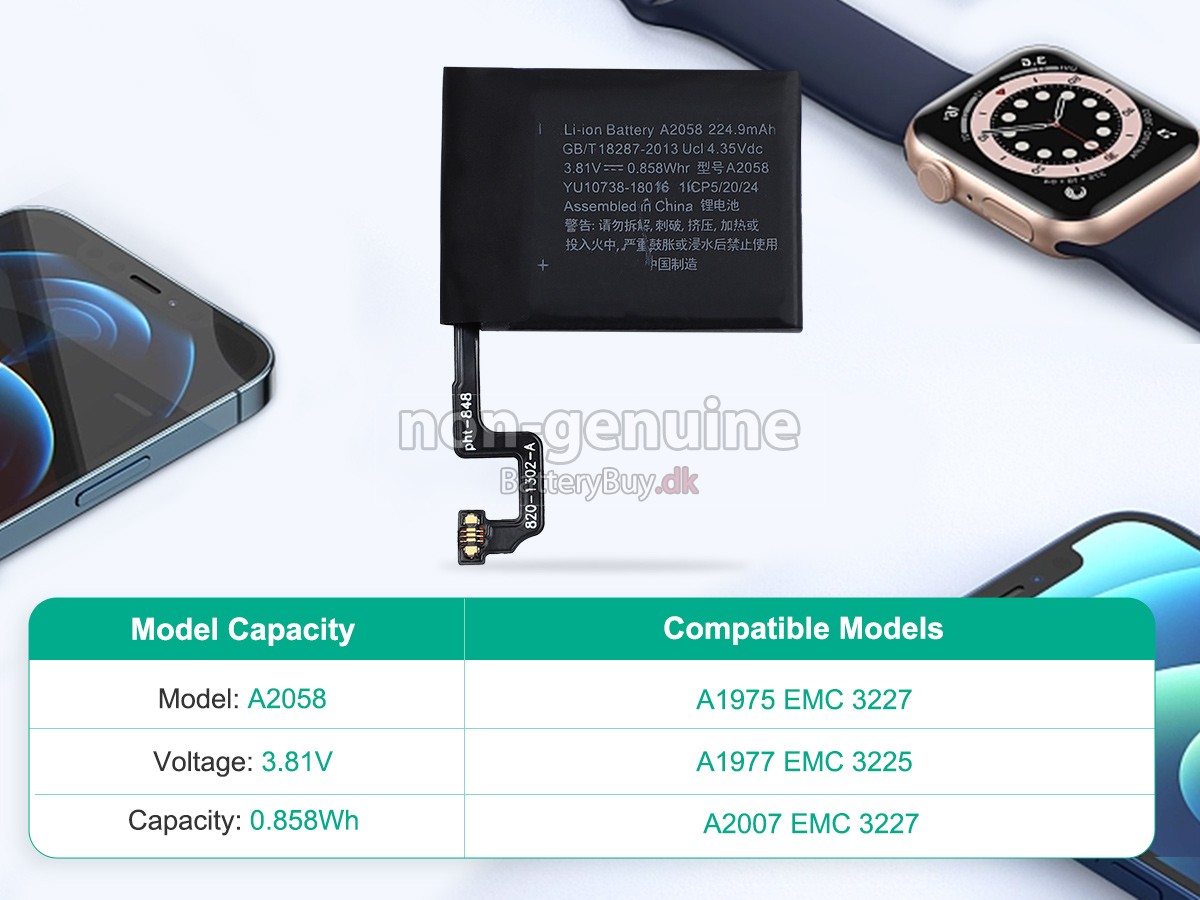 Derudover kan du se mere detaljerede billeder af dit batteri Apple A2007 EMC 3227 i "Se større billeder" eller se listen "Kompatibilitet" for at sikre, at du kan købe et erstatnings batteri til din armbåndsure.