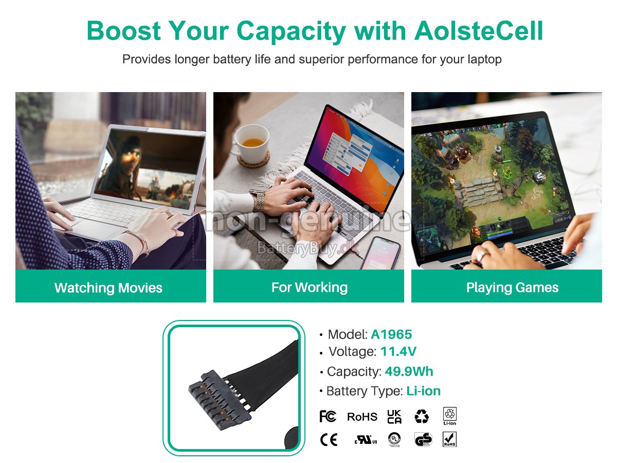 Nogle laptop batteriproducenter bruger ringere komponenter for at kunne tiltrække kunder til en lavere pris. At købe disse ringere batterier kan forårsage en række problemer som kort batterilevetid, vanskelig vedligeholdelse og endda skade på din yndlingscomputer. Men du behøver ikke bekymre dig, vi har testet Apple A2179 EMC 3302 laptop/Bærbar batteri fra mange forskellige producenter og er altid forpligtet til at give kunderne den højeste kvalitet bærbar computer batteri til Apple A2179 EMC 3302 . Vores Apple A2179 EMC 3302 batteri , der ses på BatteryBuy.dk-webstedet, skal testes med tre standardkvalitetskontroller. Vi tilbyder Apple A2179 EMC 3302 batteri , der opfylder eller overstiger OEM-specifikationer.