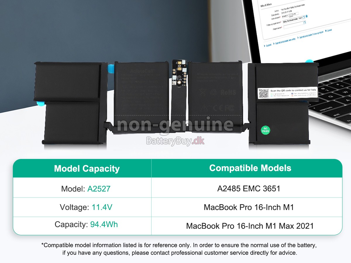 Derudover kan du se mere detaljerede billeder af dit laptop batteri Apple A2485 i "Se større billeder" eller se listen "Kompatibilitet" for at sikre, at du kan købe et erstatnings batteri til din bærbare computer.