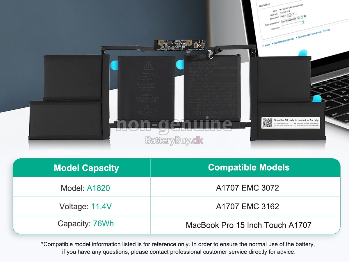 Derudover kan du se mere detaljerede billeder af dit laptop batteri Apple MacBook Pro 15 inch TOUCH A1707(Late 2016) i "Se større billeder" eller se listen "Kompatibilitet" for at sikre, at du kan købe et erstatnings batteri til din bærbare computer.