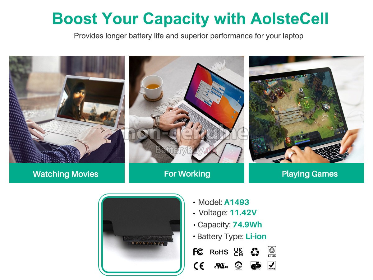 Nogle laptop batteriproducenter bruger ringere komponenter for at kunne tiltrække kunder til en lavere pris. At købe disse ringere batterier kan forårsage en række problemer som kort batterilevetid, vanskelig vedligeholdelse og endda skade på din yndlingscomputer. Men du behøver ikke bekymre dig, vi har testet Apple MGXD2LL/A laptop/Bærbar batteri fra mange forskellige producenter og er altid forpligtet til at give kunderne den højeste kvalitet bærbar computer batteri til Apple MGXD2LL/A . Vores Apple MGXD2LL/A batteri , der ses på BatteryBuy.dk-webstedet, skal testes med tre standardkvalitetskontroller. Vi tilbyder Apple MGXD2LL/A batteri , der opfylder eller overstiger OEM-specifikationer.