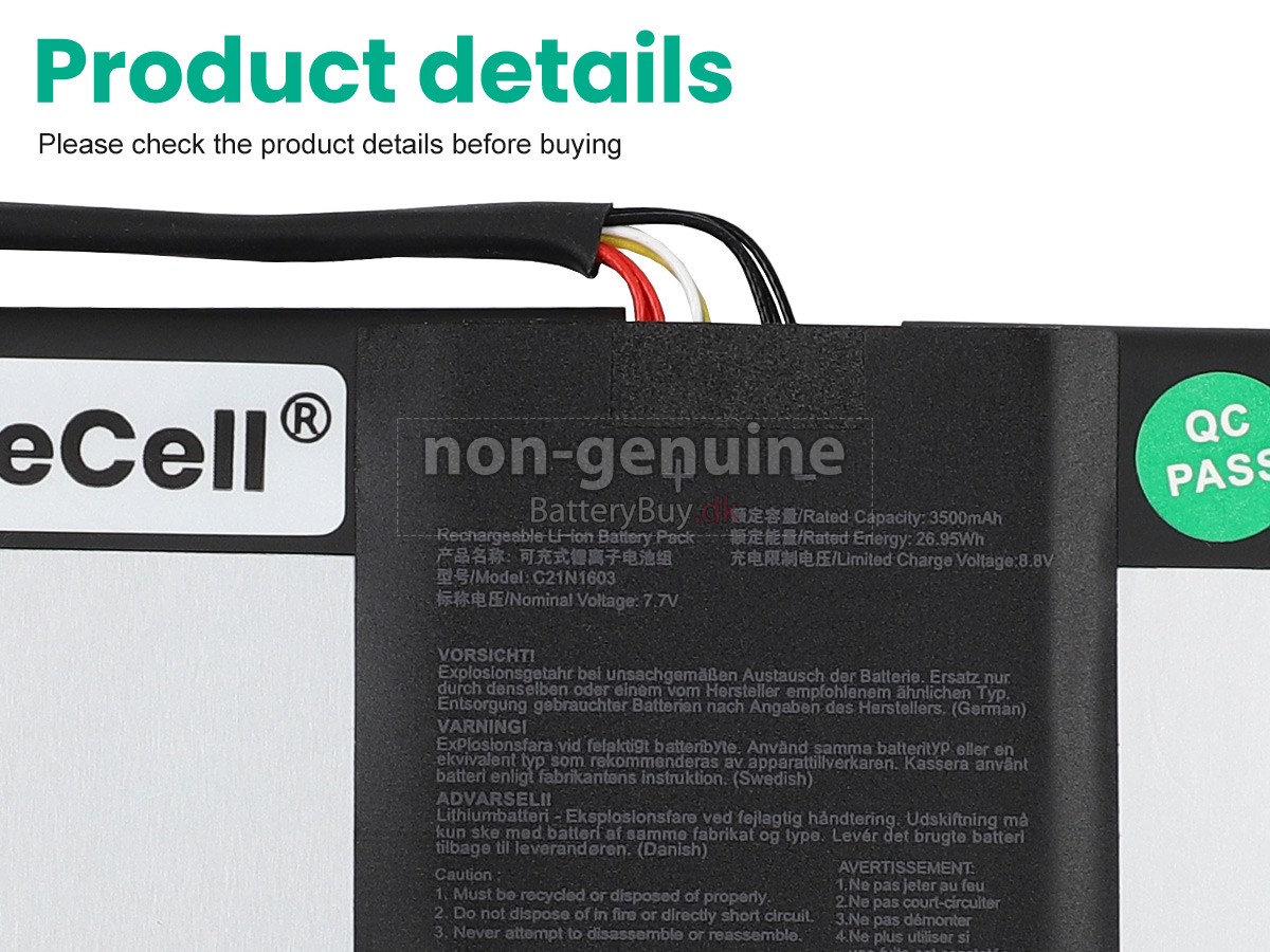 Nogle laptop batteriproducenter bruger ringere komponenter for at kunne tiltrække kunder til en lavere pris. At købe disse ringere batterier kan forårsage en række problemer som kort batterilevetid, vanskelig vedligeholdelse og endda skade på din yndlingscomputer. Men du behøver ikke bekymre dig, vi har testet Asus T303UA laptop/Bærbar batteri fra mange forskellige producenter og er altid forpligtet til at give kunderne den højeste kvalitet bærbar computer batteri til Asus T303UA . Vores Asus T303UA batteri , der ses på BatteryBuy.dk-webstedet, skal testes med tre standardkvalitetskontroller. Vi tilbyder Asus T303UA batteri , der opfylder eller overstiger OEM-specifikationer.