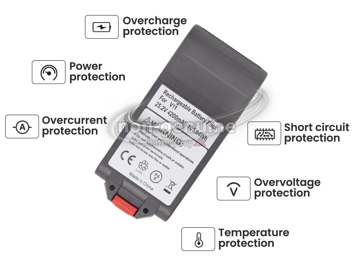 Hvert Høj kvalitet Dyson V15 DETECT batteri er født med en beskyttelseschip. Når erstatnings batteri Dyson V15 DETECT er produceret, vil det gennemgå en række tests som "overcharge", "resist voltage" og "short circuit". Efter flere skaljusteringer vil batteri til Dyson V15 DETECT være fuldt kompatible med dine støvsuger.