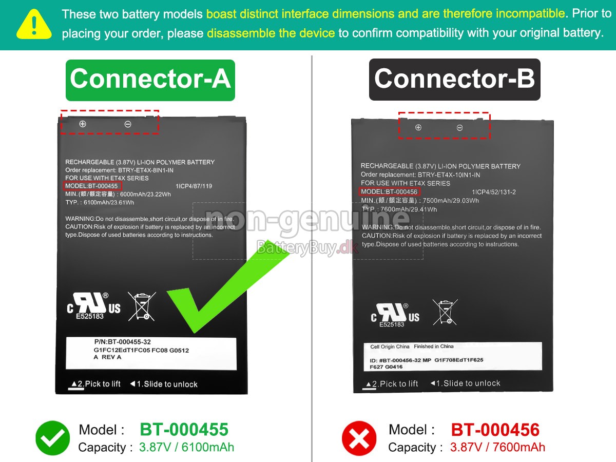 Derudover kan du se mere detaljerede billeder af dit batteri Zebra ET4X i "Se større billeder" eller se listen "Kompatibilitet" for at sikre, at du kan købe et erstatnings batteri til din udstyr.